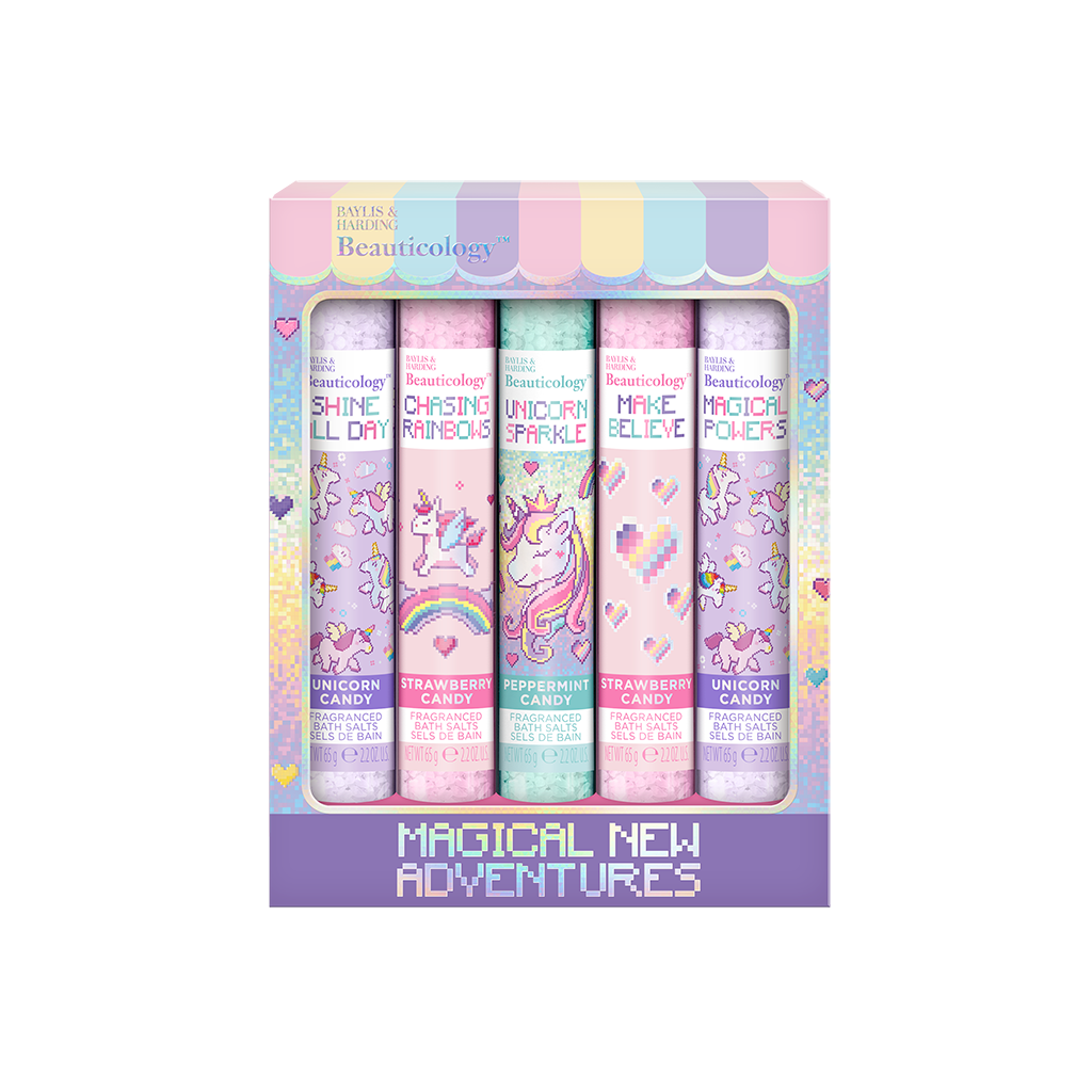 Sada obsahuje: 2 x 65g Unicorn Candy Bath Salts, 2 x 65g Strawberry Candy Bath Salts, 65g Peppermint Candy Bath Salts