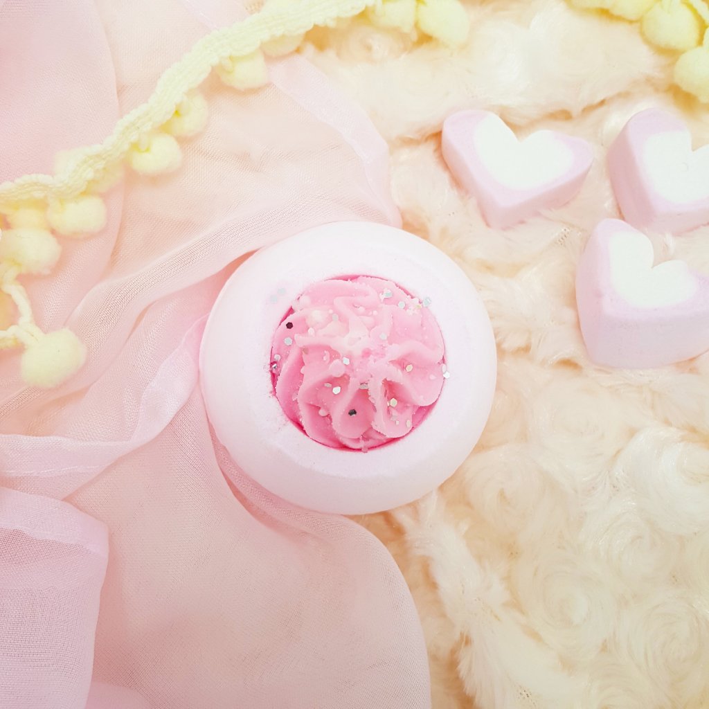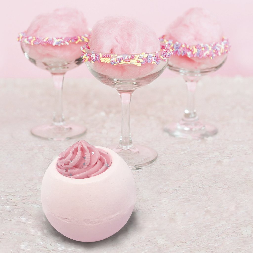 Sladká vůně cukrové vaty, marshmallow a jahod se v koupeli rozvine do jemné, hravé atmosféry, která připomene dětství. Tato růžová bomba je obohacena o kakaové a bambucké máslo, které pečují o pokožku, a navíc obsahuje esenciální oleje z jasmínu a kokosu, které zanechají tělo hebké a provoněné. Jemné třpytky dodají koupeli skvělý efekt.