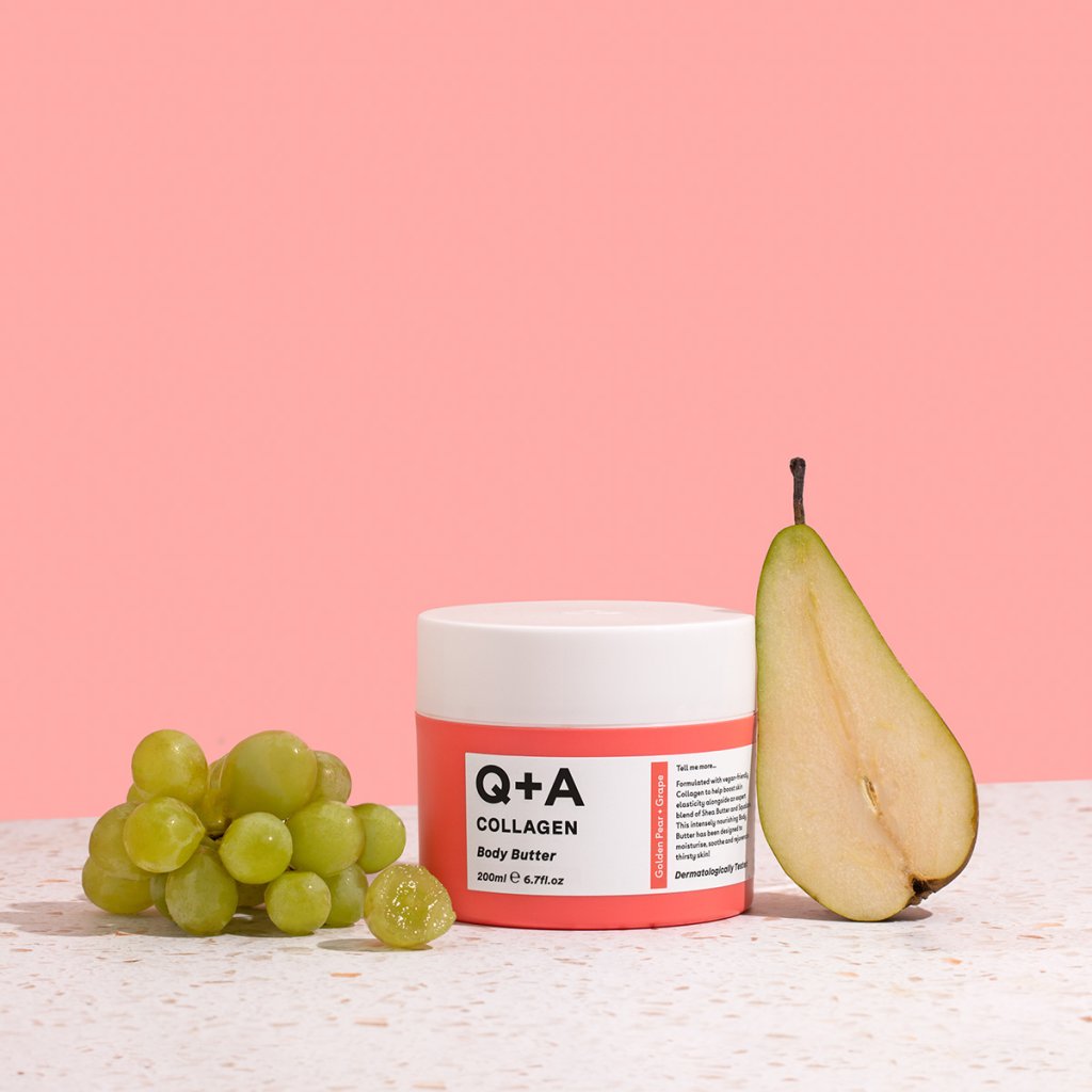 Dopřejte své pokožce hloubkovou výživu a pružnost s luxusním tělovým máslem Q+A, které kombinuje veganskou alternativu kolagenu, bambucké máslo a skvalan.