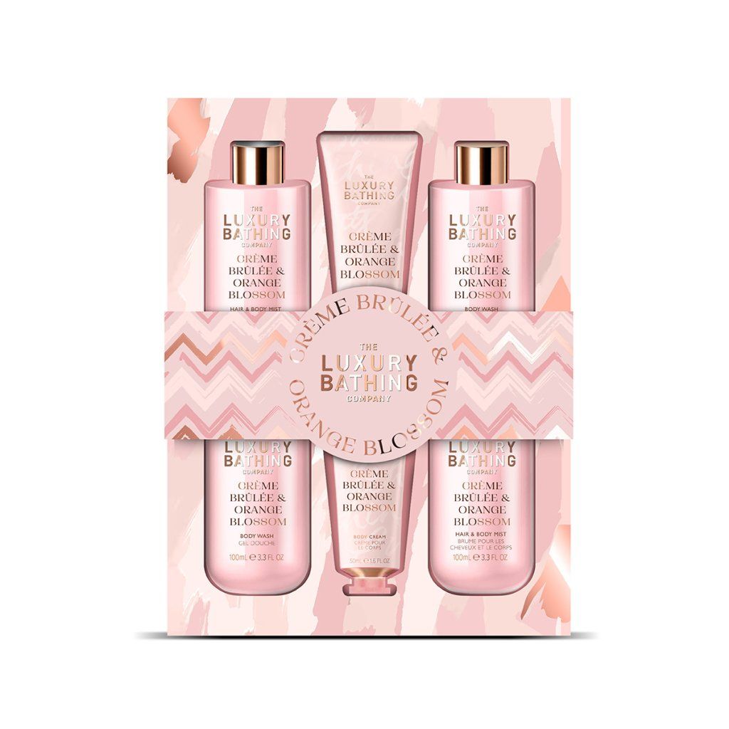Popis kolekce: Our Creme Brulée & Orange Blossom collection pairs soft pink tones with warm gold accents to create a sweet, feminine and indulgent gifting experience. With dessert-inspired fragrance notes and beautifully curated bath and body treats, each set brings a cosy, comforting touch to everyday pampering.