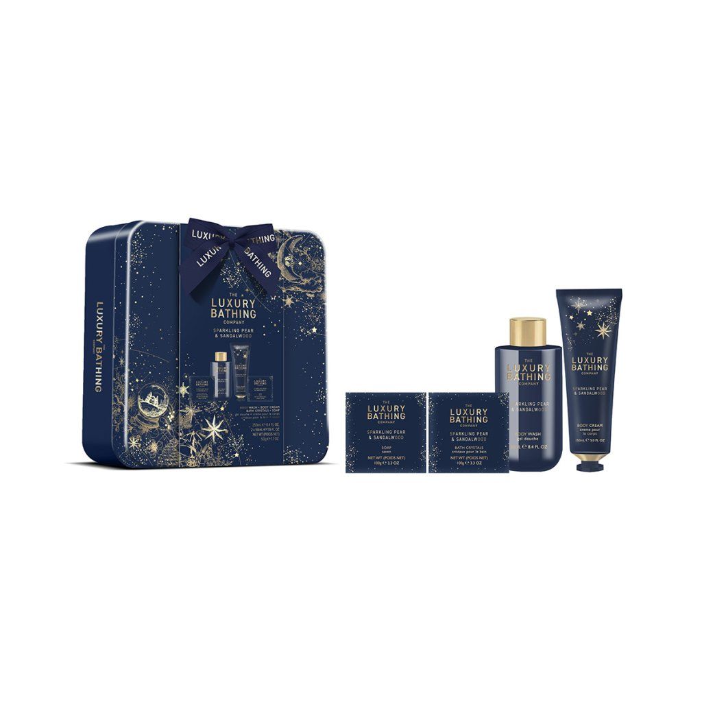 Popis kolekce: Our Sparkling Pear & Sandalwood Collection radiates understated glamour. Intricate design details, celestial accents, and a harmonious palette of midnight navy, gold and soft cream evoke timeless luxury with a modern festive touch. This is The Luxury Bathing Company at its most refined - elegant, indulgent and effortlessly giftable