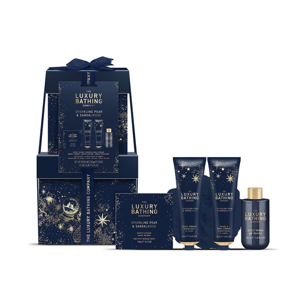 Popis kolekce: Our Sparkling Pear & Sandalwood Collection radiates understated glamour. Intricate design details, celestial accents, and a harmonious palette of midnight navy, gold and soft cream evoke timeless luxury with a modern festive touch. This is The Luxury Bathing Company at