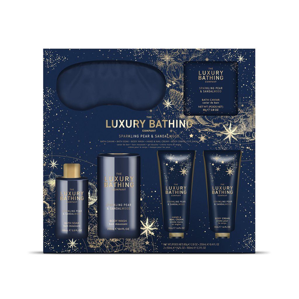 Popis kolekce: Our Sparkling Pear & Sandalwood Collection radiates understated glamour. Intricate design details, celestial accents, and a harmonious palette of midnight navy, gold and soft cream evoke timeless luxury with a modern festive touch. This is The Luxury Bathing Company at its most refined - elegant, indulgent and effortlessly giftable
