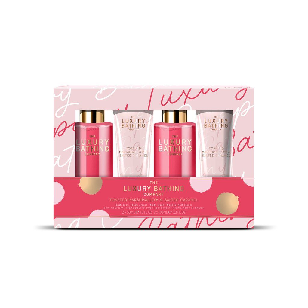 Popis kolekce: Our Toasted Marshmallow & Salted Caramel collection brings a playful, feel-good energy with its bold pink palette, expressive patterns and fun, feminine design. Packed with pampering treats - from bath fizzers to body mists - each gift set delivers a vibrant, joyful night-in experience.