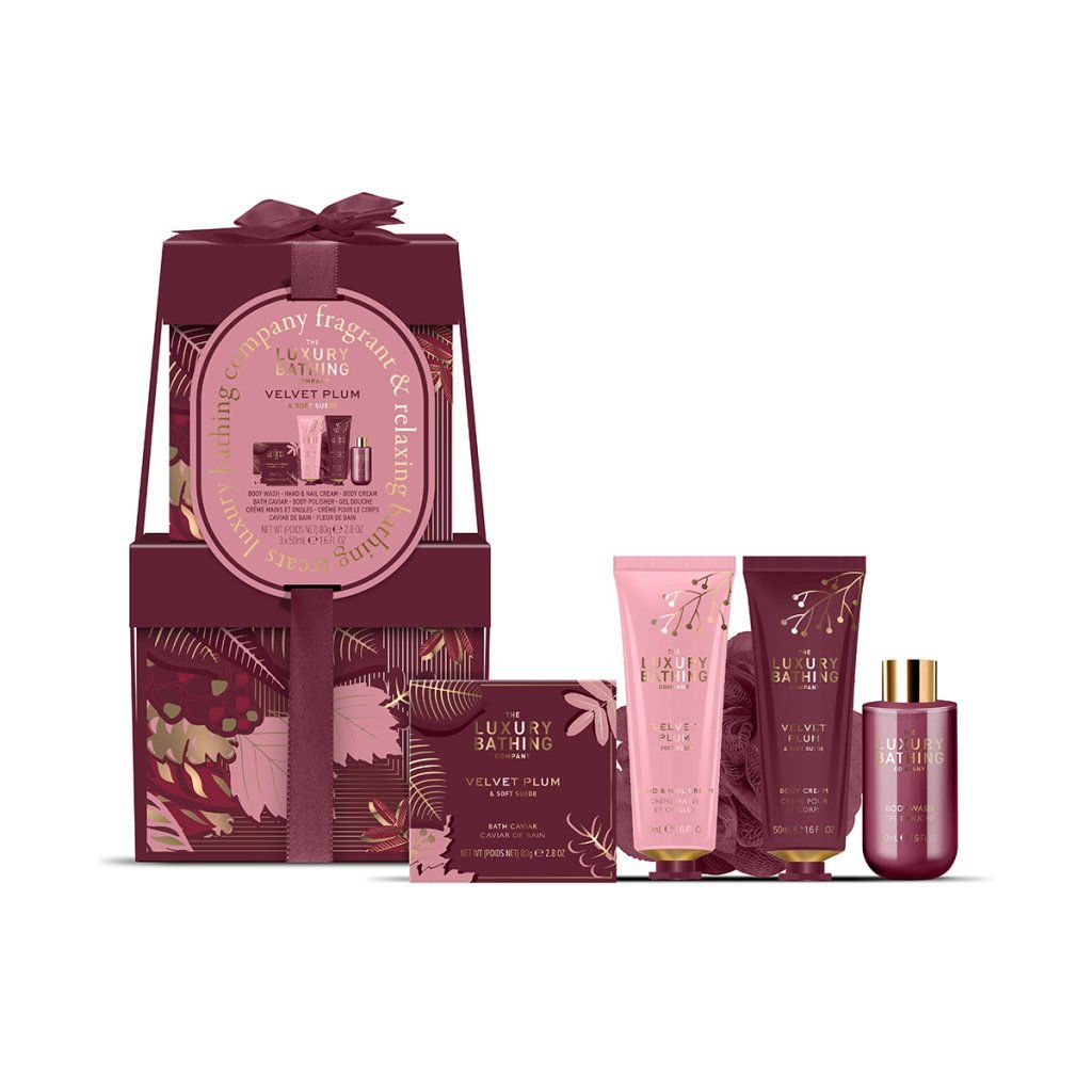 Popis kolekce: Our Velvet Plum & Soft Suede collection blends rich berry tones, gold accents and velvet textures to create a sense of effortless glamour. With indulgent formats such as bath caviar, body wash and body cream, plus beautifully finished gifting like patterned velvet bags, this range elevates every bathing moment into something special.