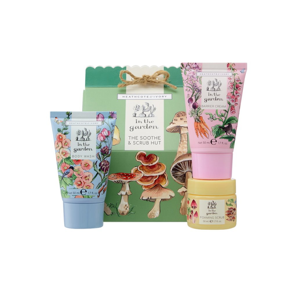 The Soothe & Scrub Hut je hravá dárková sada inspirovaná kouzlem zahrady a lesních zákoutí, která ukrývá tři pečující produkty pro kompletní rituál péče o tělo. Balení ukrývá ochranný krém s vůní rebarbory, šeříku a bílých růží, obohacený o bambucké máslo, vitamin E a tymiánový olej, doplněný o extrakt z mrkve a zklidňující měsíček pro výživu a ochranu pokožky. Sadu dokonale doplňuje cukrový peeling a sprchový gel, které společně čistí, vyhlazují a zanechávají pokožku jemnou, hebkou a provoněnou.