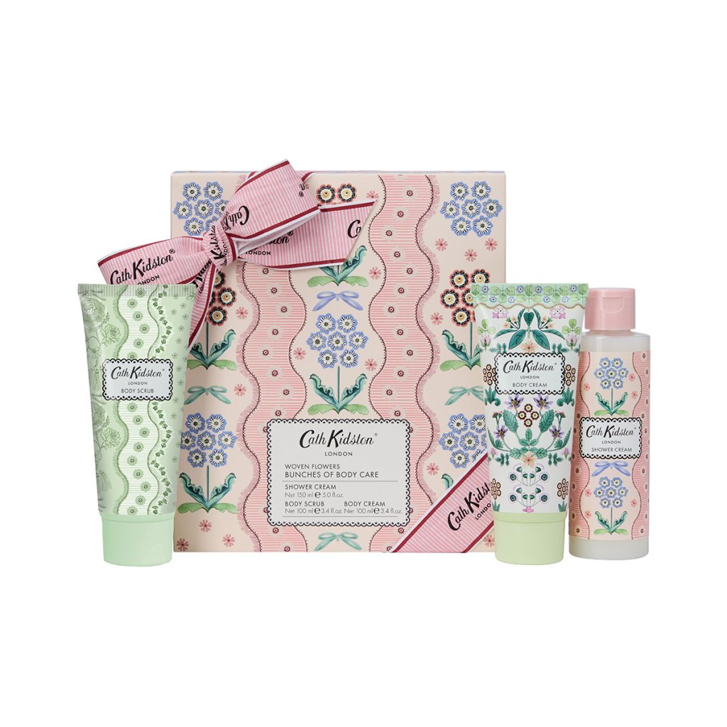 Objevte krásně zabalený dárkový set Woven Flowers od Cath Kidston, který promění každodenní koupel v malý pečující rituál. Elegantní krabička převázaná mašlí a zdobená jemnými květinovými ilustracemi z kolekce Woven Flowers z něj dělá ideální dárek pro chvíle relaxace.