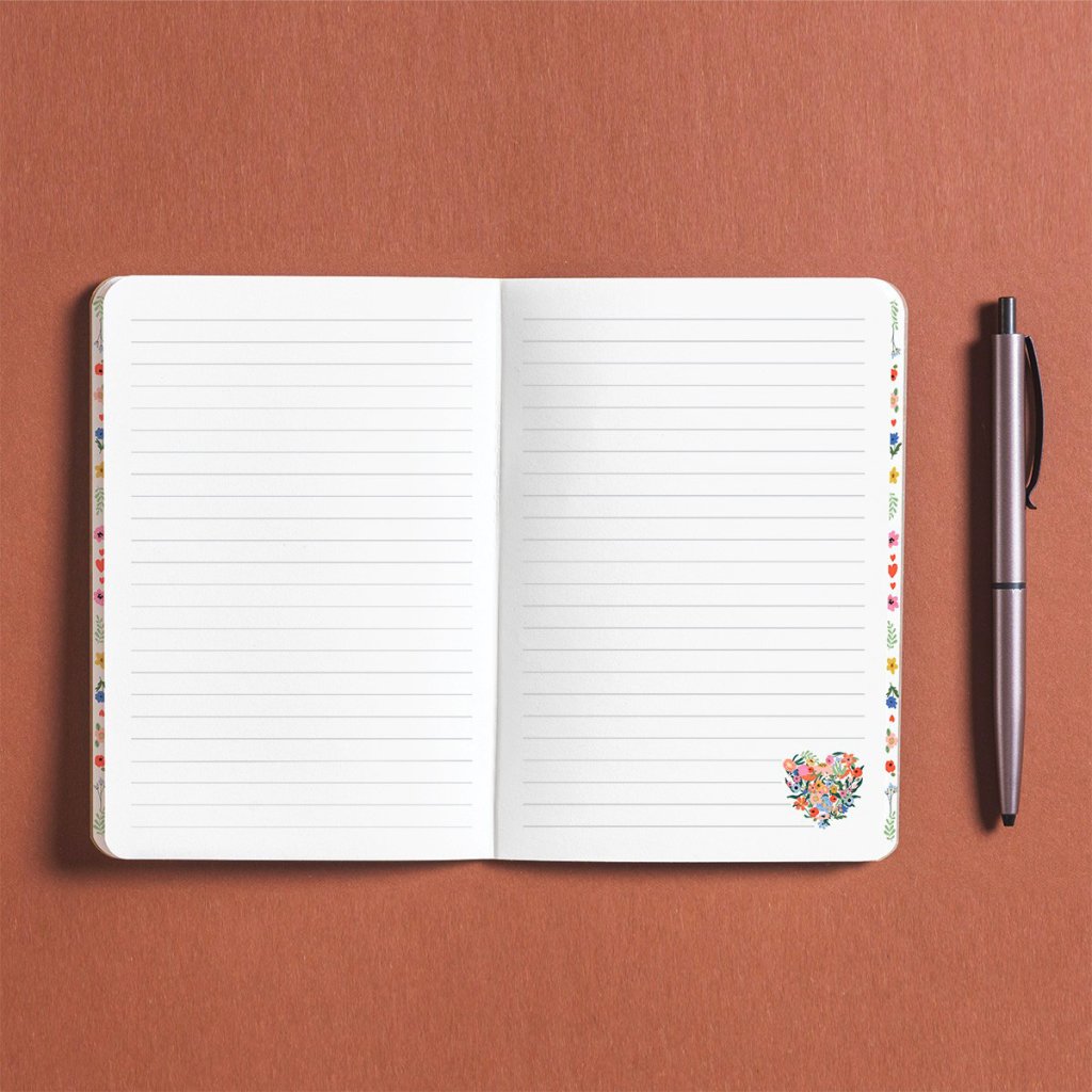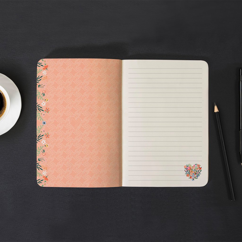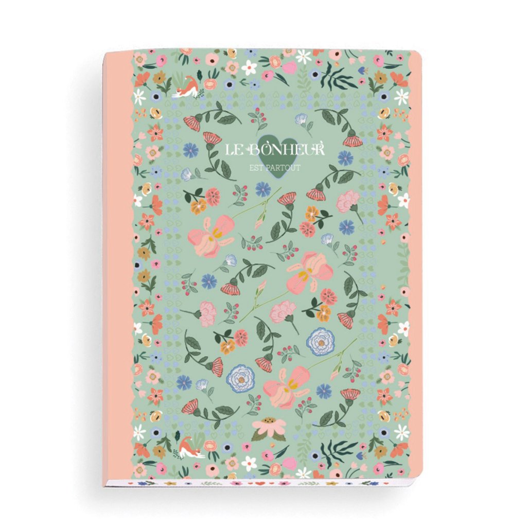Praktický zápisník ve formátu A5 z oblíbené kolekce Le bonheur est partout ("Štěstí je všude") od francouzské značky Hirondelles & Cie. Obálku zdobí bohatý květinový motiv v jemně zeleném tónu s růžovým hřbetem a decentním nápisem uprostřed.