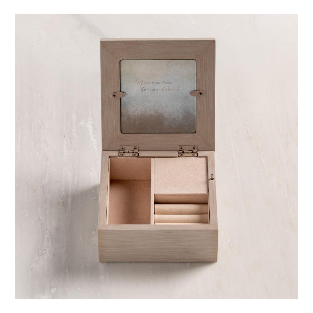 Vyřezávaná šperkovnice hraje krásnou melodii. Na víku je ornament dvou naproti sobě sedících postav. Šperkovnice je rozdělená na tři přihrádky a na víku je nápis " You are my friend" - Jsi můj přítel.