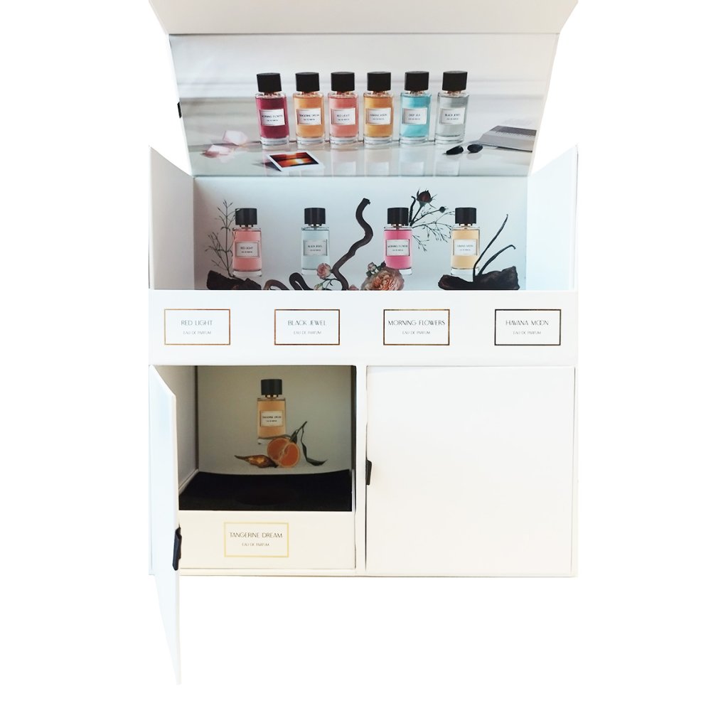 Luxusní prezentační box Jeanne Arthes – Collection Privée je elegantní řešení pro atraktivní vystavení parfémů na prodejní ploše. Prémiové zpracování umožňuje přehlednou prezentaci jednotlivých vůní a zároveň zaujme zákazníka na první pohled. Ideální pro parfumerie a dárkové prodejny jako stylový merchandisingový prvek podporující prodej celé kolekce.