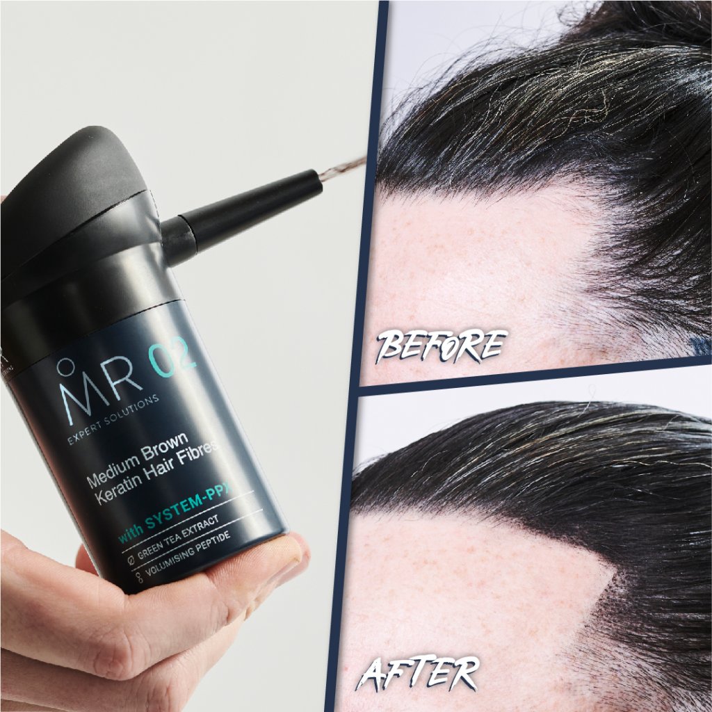Řídnoucí vlasy? MR Hair Fibres ve středně hnědém odstínu vytvoří během pár vteřin plnější a hustší vzhled. Přírodní keratinová vlákna jsou elektrostaticky nabitá, takže se okamžitě přichytí ke stávajícím vlasům a dokonale s nimi splynou – ideální pro kouty, linie vlasů nebo temeno hlavy. Během několika vteřin vytvoří efekt hustšího účesu, který vypadá naprosto přirozeně a působí dojmem skutečných vlasů.