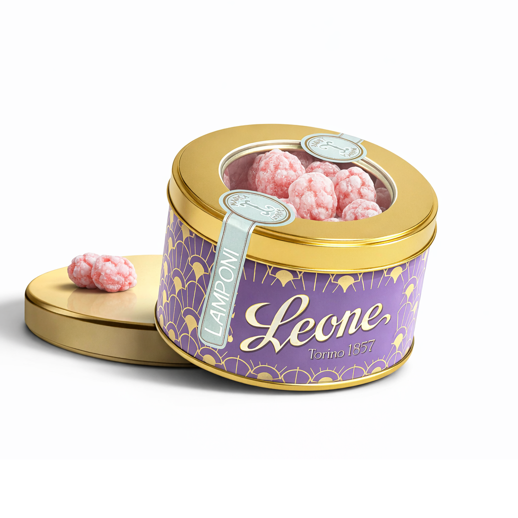 Lamponi, Bonbony s příchutí malin v plechové dóze, 150 g Leone 1857