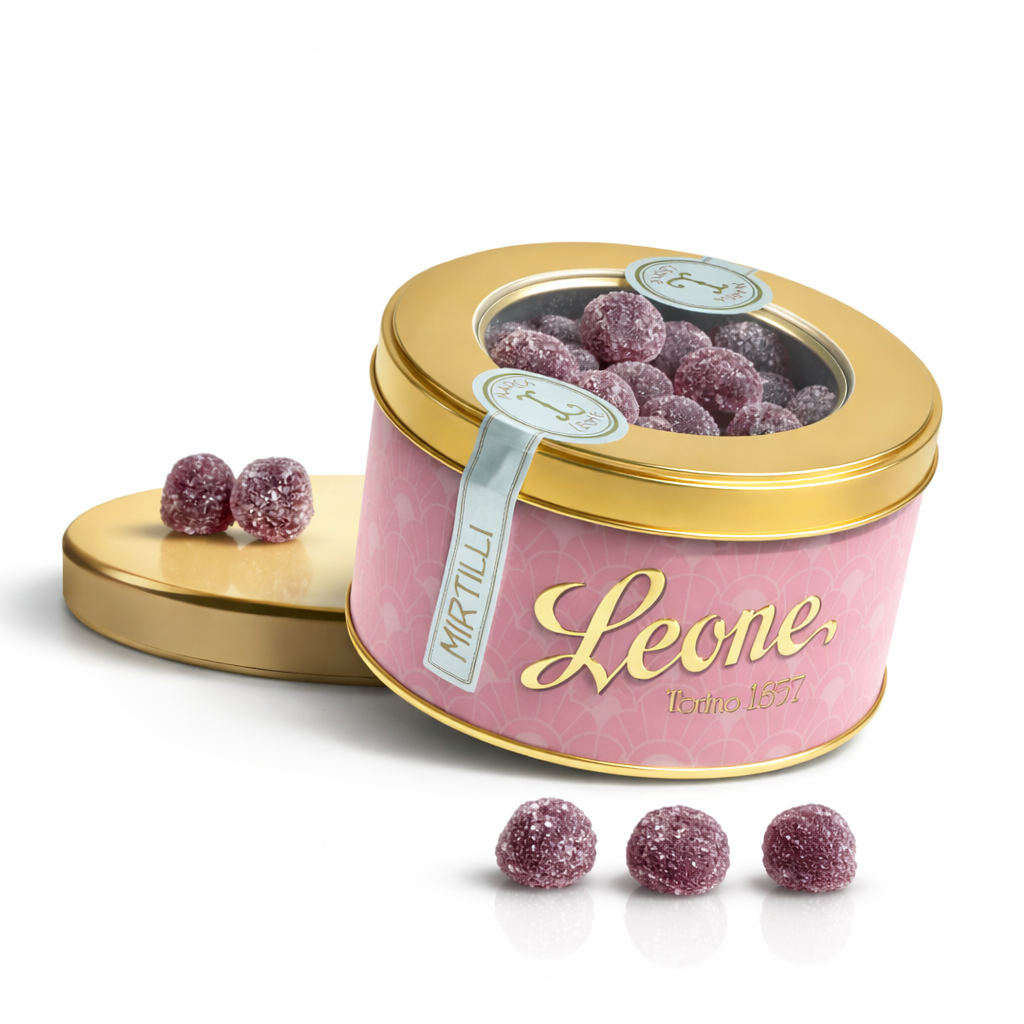 Mirtilli, Želé bonbony s příchutí borůvek v plechové dóze, 150 g Leone 1857