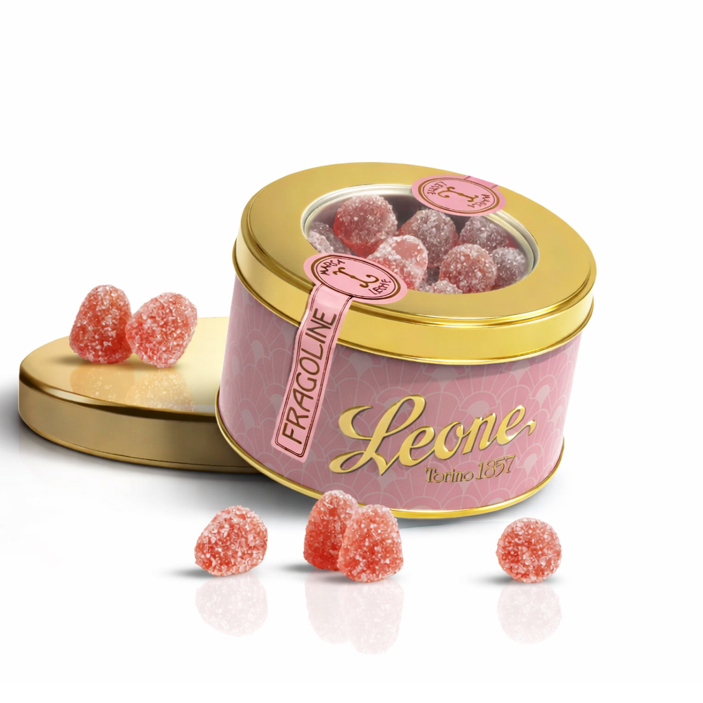 Fragoline, Želé bonbony s příchutí lesních jahod v plechové dóze, 150 g Leone 1857