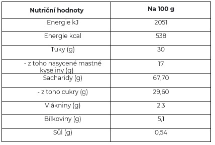 | Složení: | Složení: Pšeničná mouka, máslo, kousky bílé čokolády 11% ( cukr, plnotučné sušené mléko, kakaové máslo, odstředěné sušené mléko, emulgátor: sójový lecitin, přírodní vanilkové aroma), jahodové kousky 5% (cukr, jahodová šťáva. citronová dužina, želírující činidlo: pektin, ovesná vláknina, přírodní aroma, , šťáva z akácie a bezu: koncentrát), přírodní aroma. |