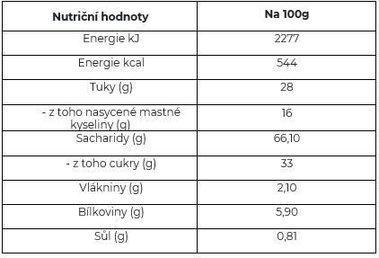 | Složení: | Složení: Pšeničná mouka, máslo, kousky mléčné čokolády 18% (cukr, plnotučné sušené mléko, kakaové máslo, kakaová hmota, syrovátkový prášek, Emulgátory: sójový lecitin, přírodní vanilková přichuť), cukr, třtinový cukr Muscovado (cukr, melasa), vejce pasterovaná, kypřidla: jedlá soda, difosfát), rýžová mouka. |