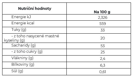 | Složení: | Složení: Pšeničná mouka, máslo, cukr, kousky karamelu (hnědý cukr, glukóza, máslo, sůl, přírodní aroma) sůl, přírodní aroma, kypřidlo: ammonium bicarbonate. Může obsahovat stopy ořechů, vajec, hořčičného semínka, ovsa, sezamu a sóji. |