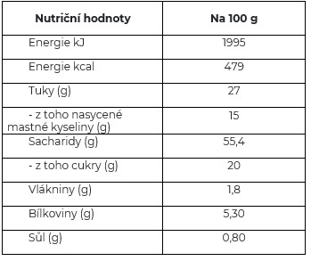 | Složení: | Složení: Pšeničná mouka, máslo 29%, cukr, kukuřičný škrob, mandlové plátky 5%, třtinový cukr demerara, mleté mandle 1%, přírodní aroma. |