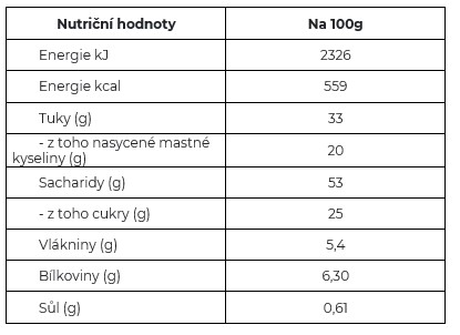 | Složení: | Složení: Ovesné vločky, máslo (mléko, sůl), cukr, kousky karamelu (hnědý cukr, glukózový sirup (pšenice), máslo (mléko, sůl), palmový olej, přírodní aroma), mořská sůl |