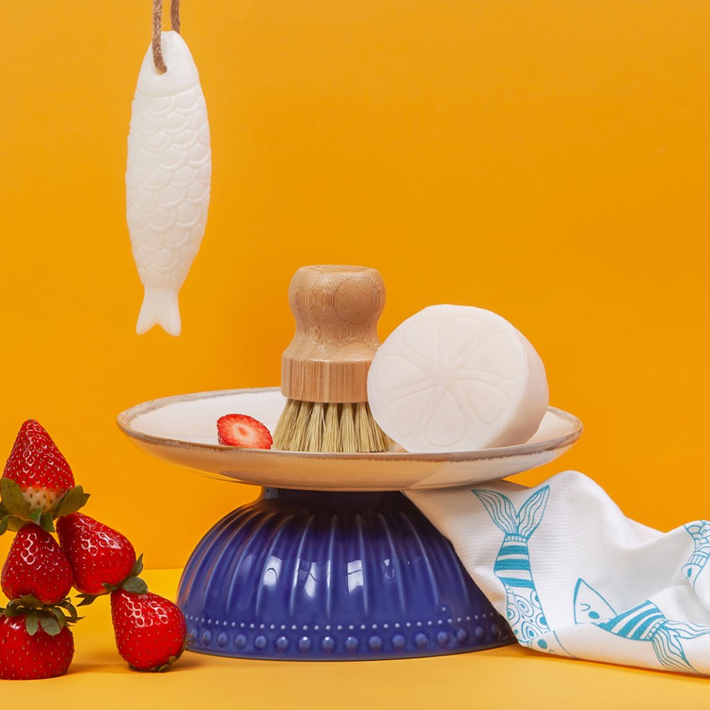 Proměňte svou kulinářskou říši v čisté prostředí pomocí naší limitované kolekce obsahující čtyři základní produkty do kuchyně, plátěnou tašku na nákup a brožurku s recepty. Tato sada ztělesňuje udržitelnost a zároveň si zachovává dokonalý styl a funkčnost. Bambusový kartáč společně s mýdlem ve tvaru půl citronu je perfektní dvojkou produktů pro mytí nádobí, zatímco se mýdlo ve tvaru sardinky postará o Vaše ruce. Nechybí ani bavlněná, vysoce savá utěrka s potiskem sardinek, brožurka s recepty a plátěná taška pro každodenní nákupy.