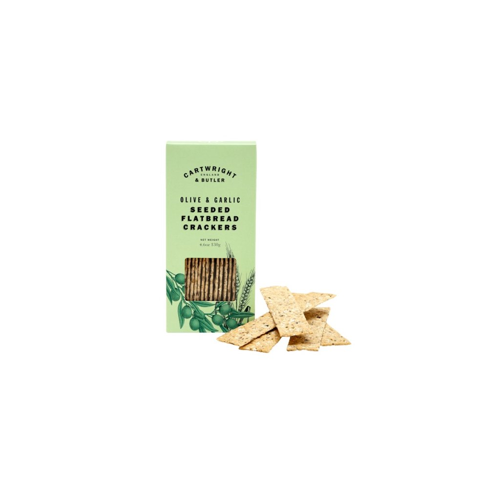 Seeded Flatbread Crackers - Olive & Garlic, Semínkové krekry s česnekem a olivami, 130 g Cartwright & Butler