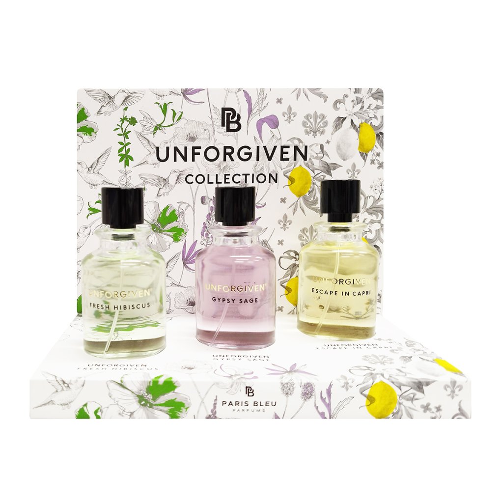 Papírový stojánek na 3 francouzské vůně z kolekce Unforgiven - Fresh Hibiscus, Gypsy Sage, Escape in Capri.