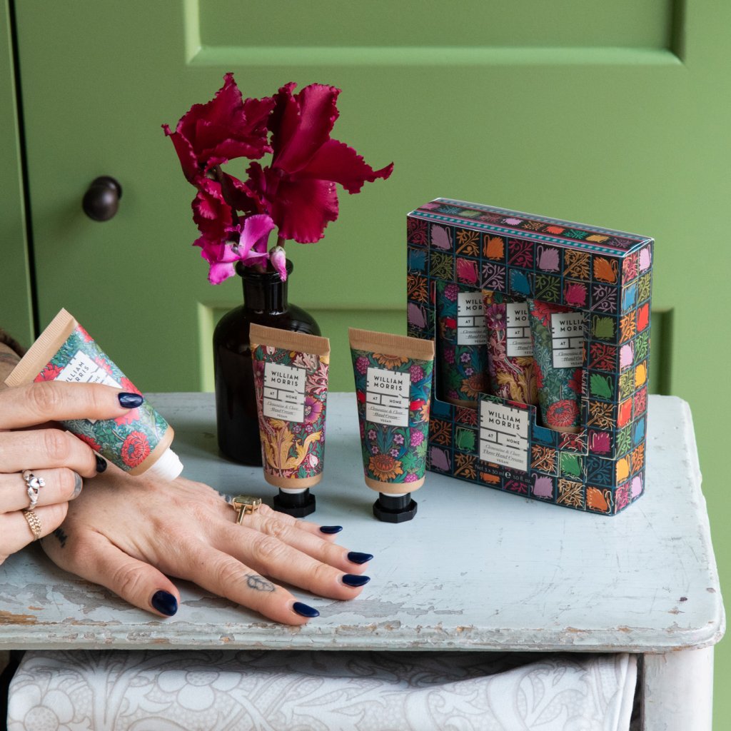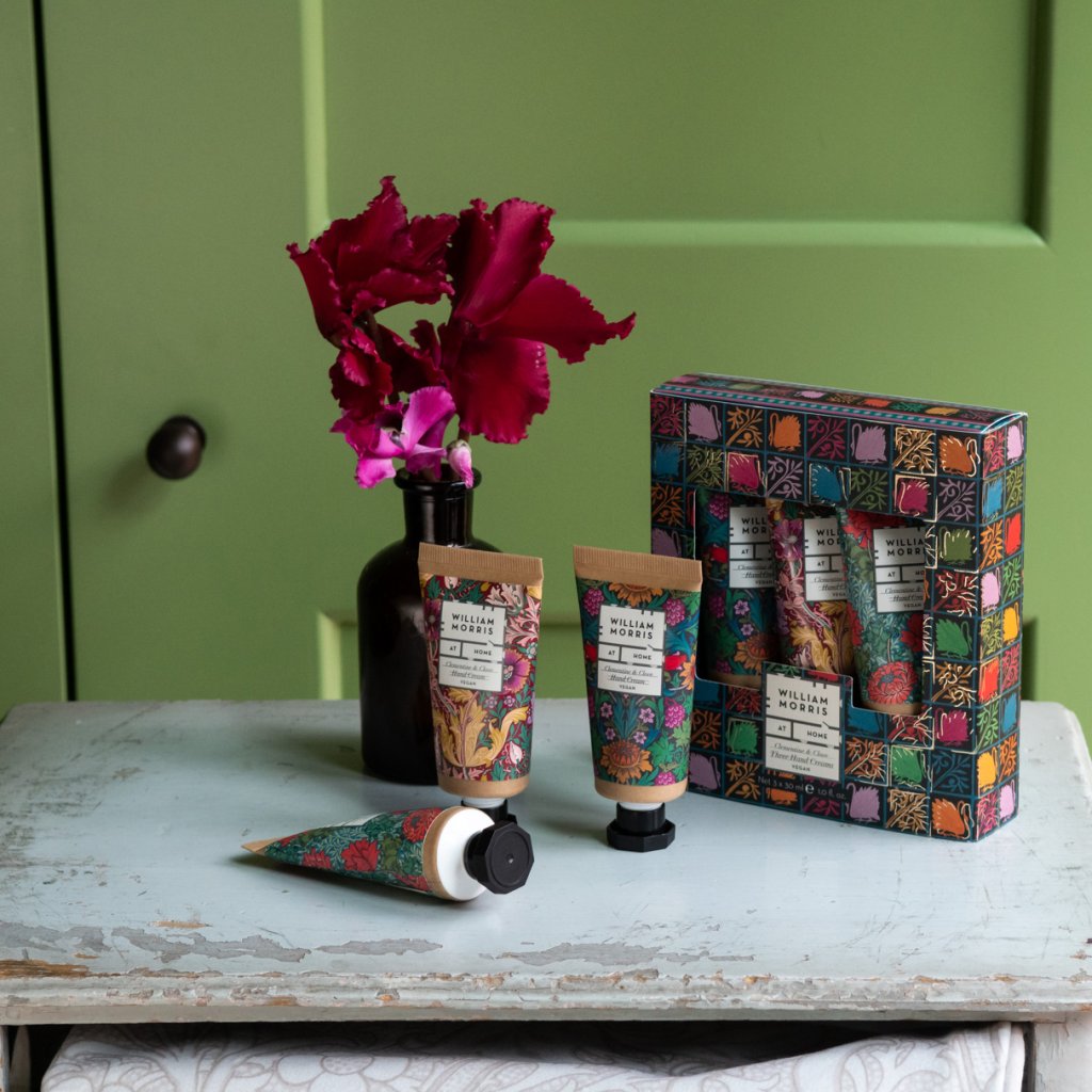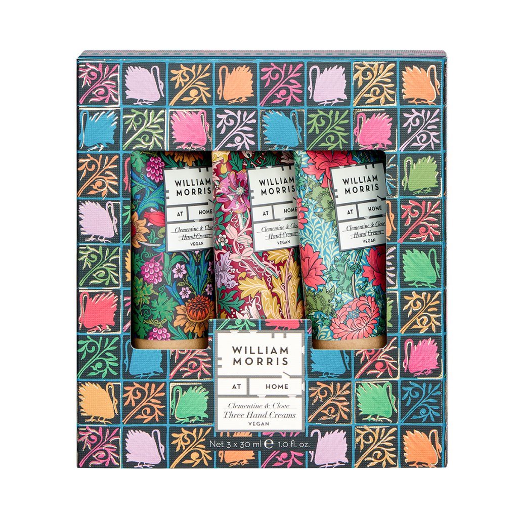 Elegantní sada tří krémů na ruce s vůní Clementine & Clove v ikonických designech Williama Morrise je ideálním dárkem pro zimní období. Krémy jsou obohaceny o bambucké máslo, kakaové máslo a vyživující oleje, které pečují o pokožku a zanechávají ji jemnou a hydratovanou. Jemná, sametová textura se rychle vstřebává a provoní ruce slavnostní vůní se sladkými tóny mandarinky, hřebíčku a špetkou skořice. Díky praktickému cestovnímu balení jsou krémy ideální do kabelky, kapsy nebo jako drobný dárek pro radost.
