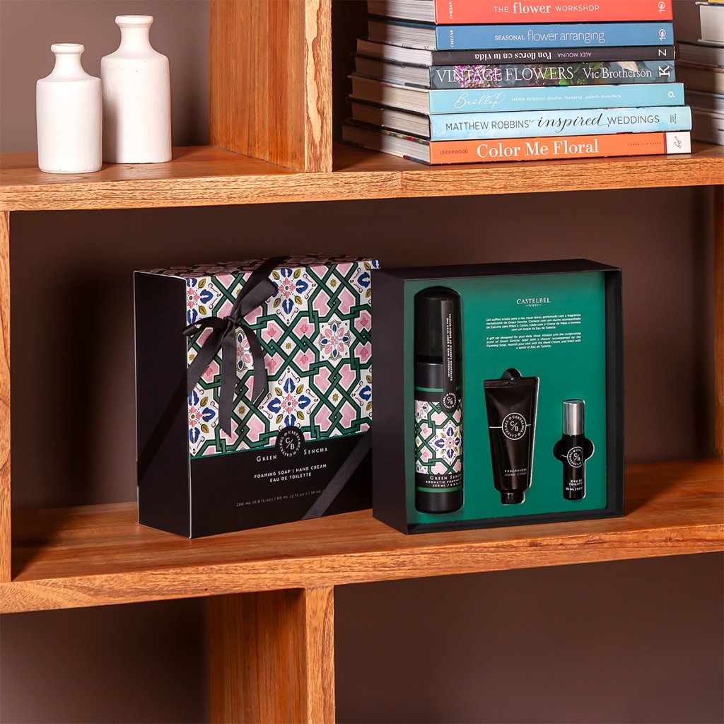 Elegantní sada inspirovaná portugalskou tradicí a jemnou vůní ukrývá pěnivé mýdlo, které jemně čistí pokožku, krém na ruce pro hydratovanou a jemnou pokožku a mini toaletní vodu ideální na cesty. Celá kolekce v sobě nese vitalitu zeleného čaje Sencha a jemné citrusové tóny.