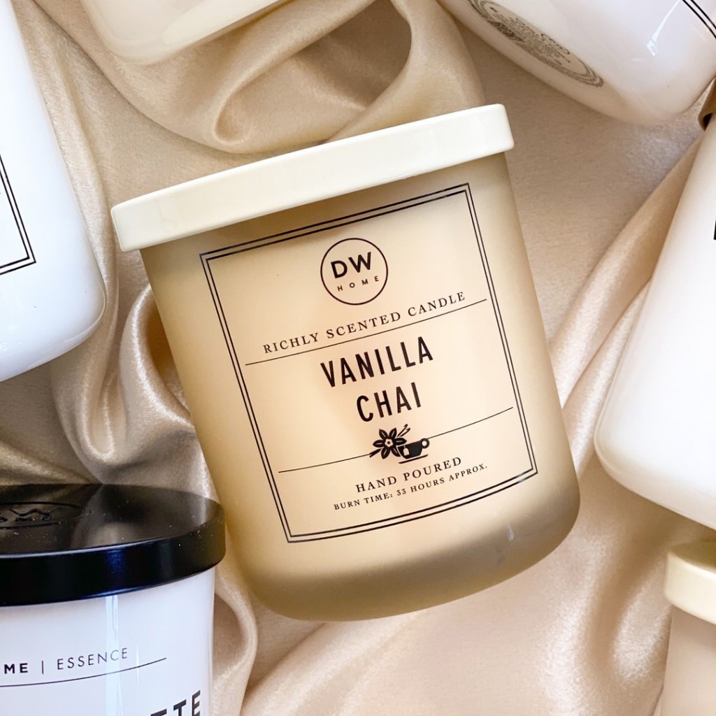 Vonná svíčka Vanilla Chai od DW Home je jako šálek voňavého chai latté v chladném zimním dni. Teplé tóny zázvoru, kardamomu, skořice a hřebíčku se snoubí s černým čajem a jemně nasládlým mandlovým mlékem, což vytváří uklidňující atmosféru. Vůně je bohatá, kořeněná a krémově sladká – ideální pro chvíle, kdy si chcete vychutnat klid a pohodu domova. Perfektní svíčka pro zimní večery plné tepla a odpočinku.